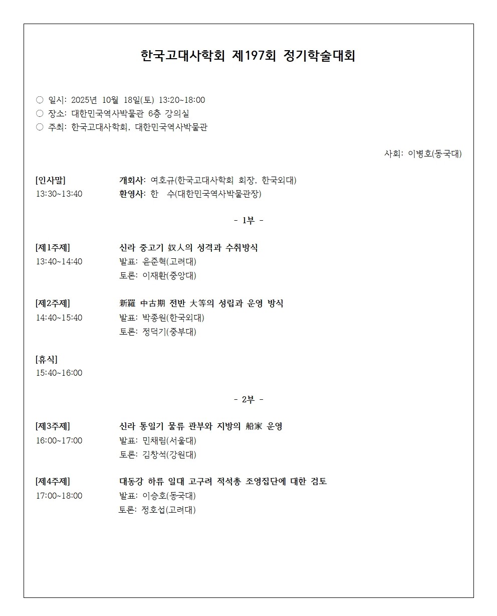 [공지] 한국고대사학회 제197회 정기발표회 안내