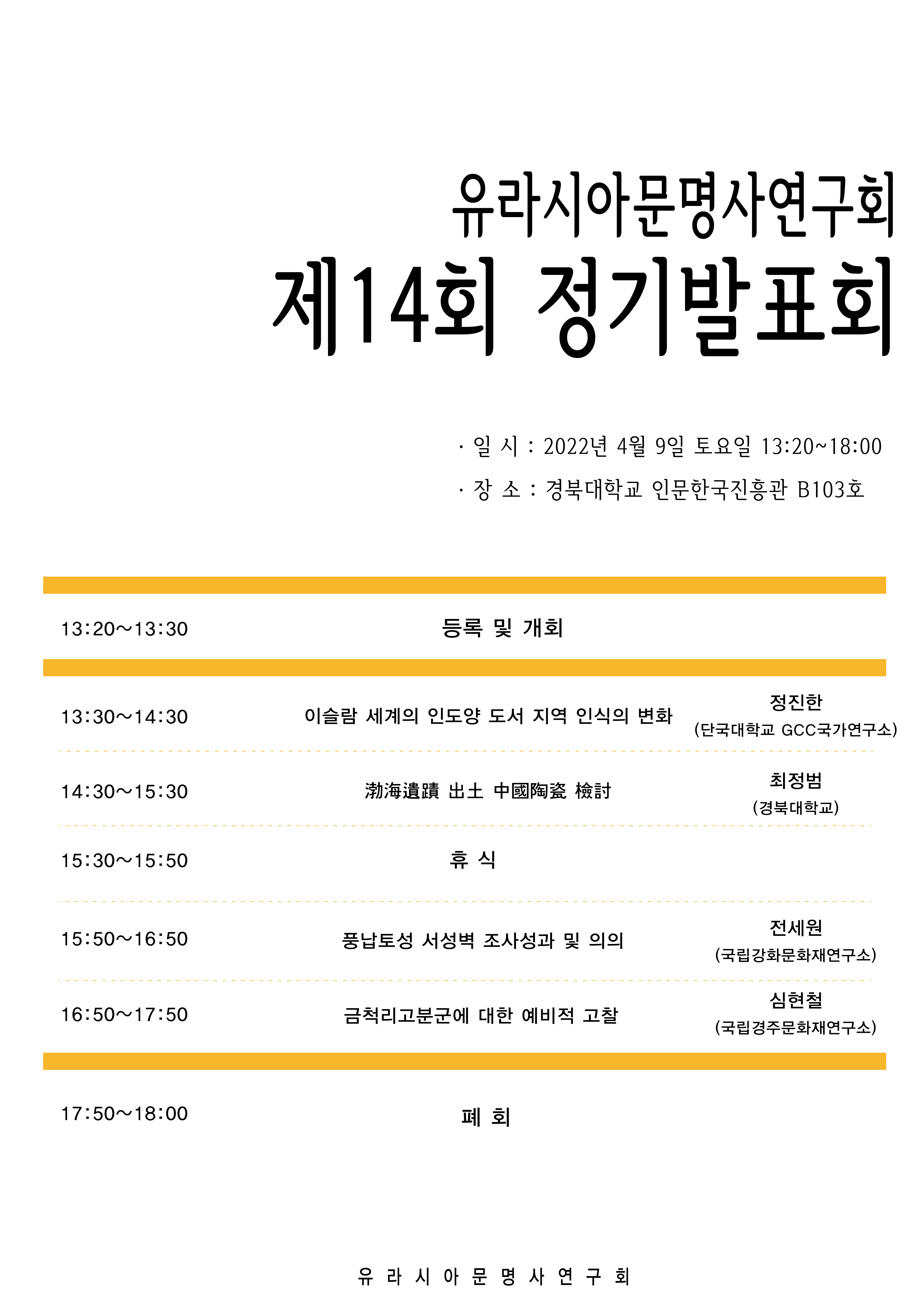 2022년 4월 9일 토요일, 〈유라시아문명사연구회 제14회 정기발표회〉를 개최하고자 합니다.