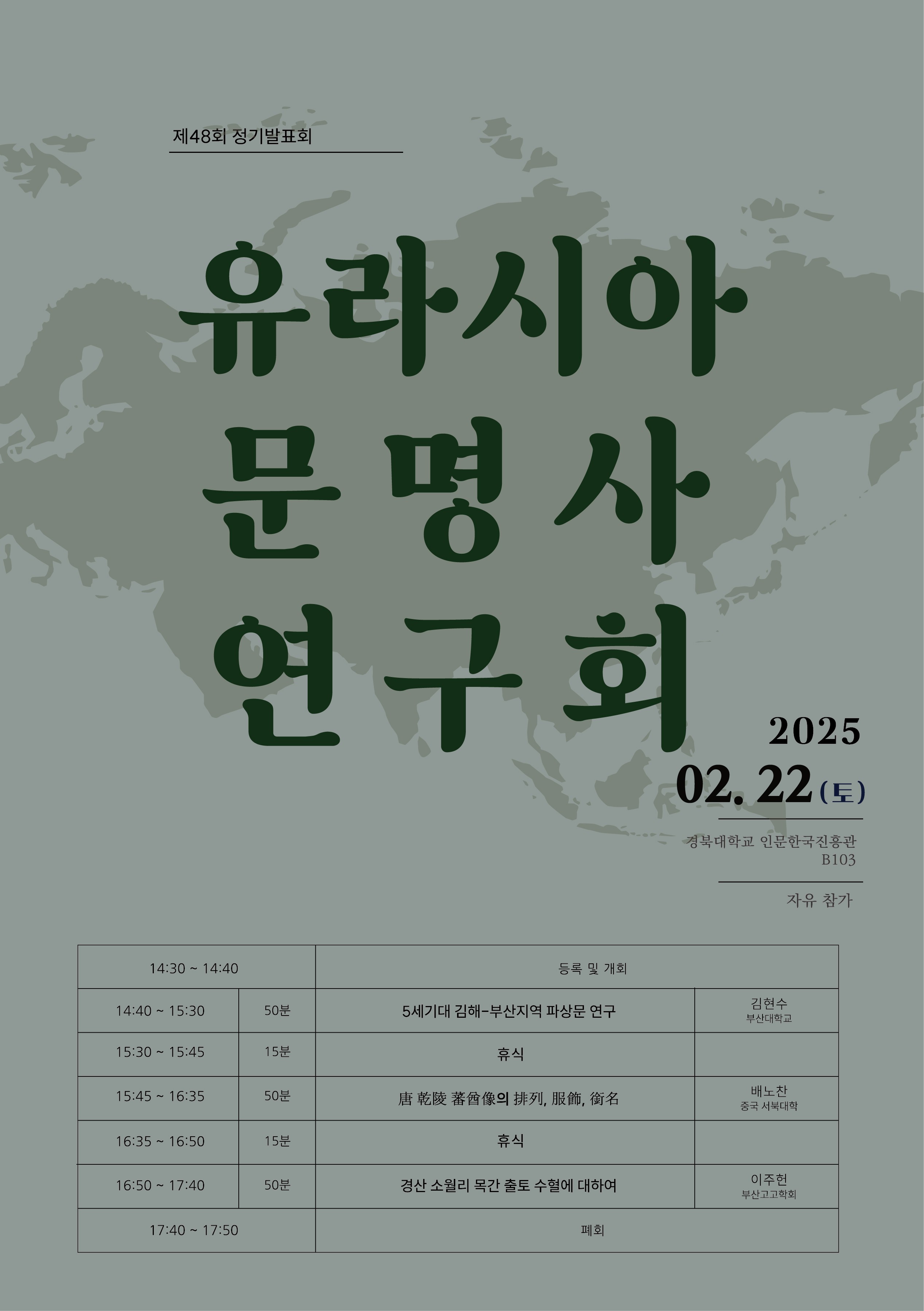 2025년 2월 22일 토요일, 유라시아문명사연구회 제48회 정기발표회가 진행될 예정입니다.